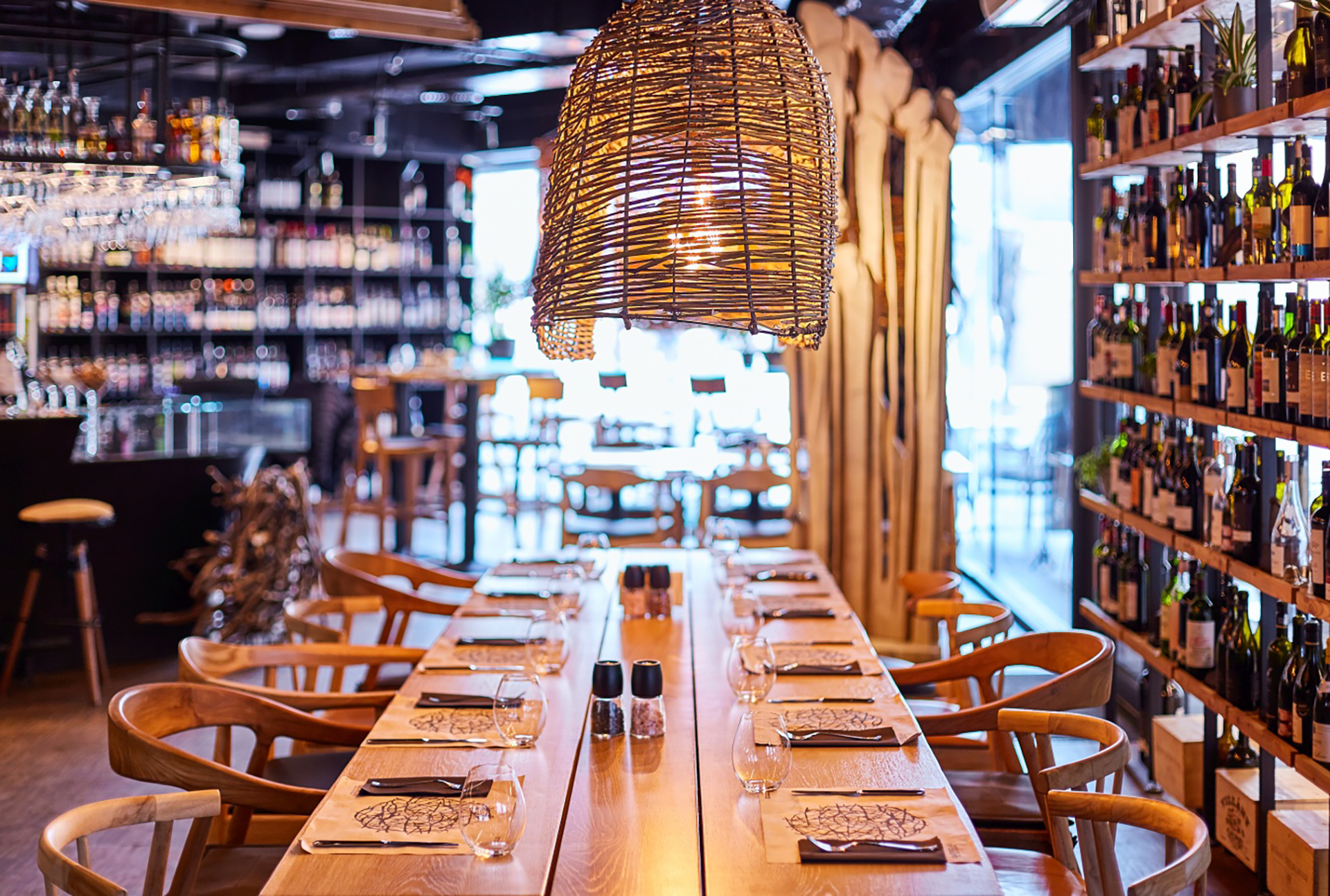 The starting point of the project was the identity developed over the last three years at Balvanyos Resort together with its owners and Gyarfas Olah, artist and fashion designer. The main brief of the project was the continuation of this identity in Bucharest, adapting it to the urban environment without losing the atmosphere and the sensibility of the original place. GastroLAB Balvanyos is a nature retreat, an open space with a welcoming atmosphere and a menu based on local ingredients. Its introduction to the central Bucharest setting has been translated into an urban restaurant with a modern kitchen and a substantial selection of wines. In our vision, a restaurant is sustained by three ingredients: food, people and ambience. The identity of the place is given by the use of natural materials and the visual presence of the wine bottles. Natural oak wood, wicker objects, glass in different shapes, natural calf-skin all on a dark background fill out the space. The ceiling, structured by wooden elements, visually leads the client to the main areas: the bar, the dining area, the wine shop and the open kitchen. The interior lighting produces space, sculpting islands of intimacy. The logo is inspired by the sculpture created by Gyarfas Olah for GastroLAB Balvanyos, also remade in-situ in Bucharest. GastroLAB is a new restaurant with warm and familar atmosphere, a place where you can come back, as if it always has been there.
